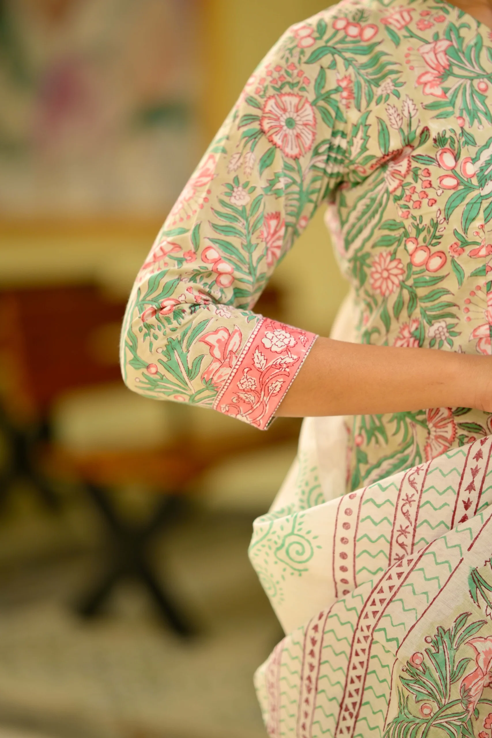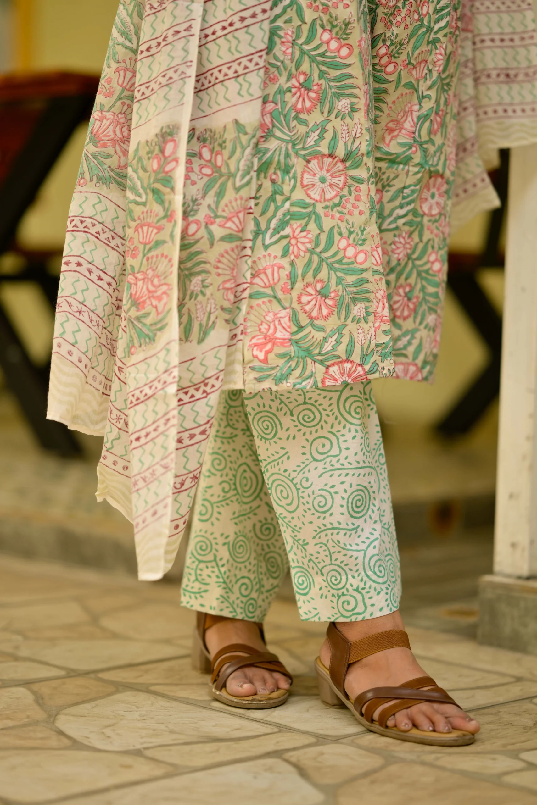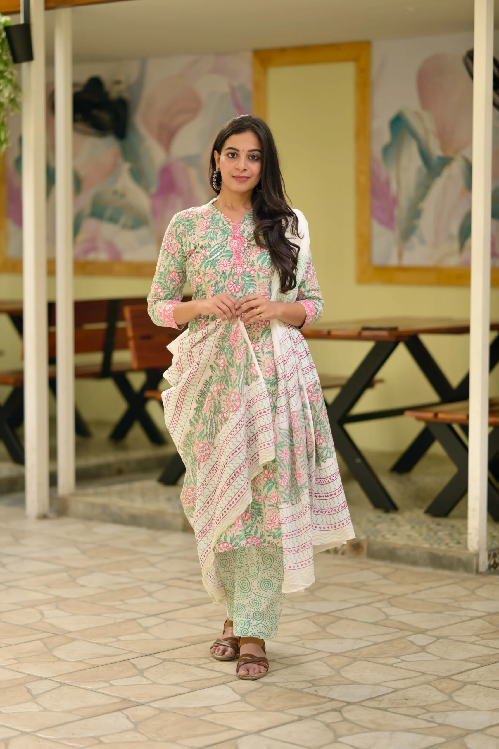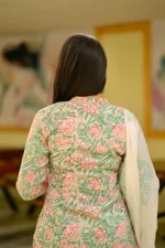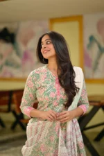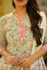 A soft and comfortable cotton salwar set designed for everyday wear with a touch of elegance. The kurta features a beautiful mint green base with delicate pink floral prints, giving it a fresh and calming look.