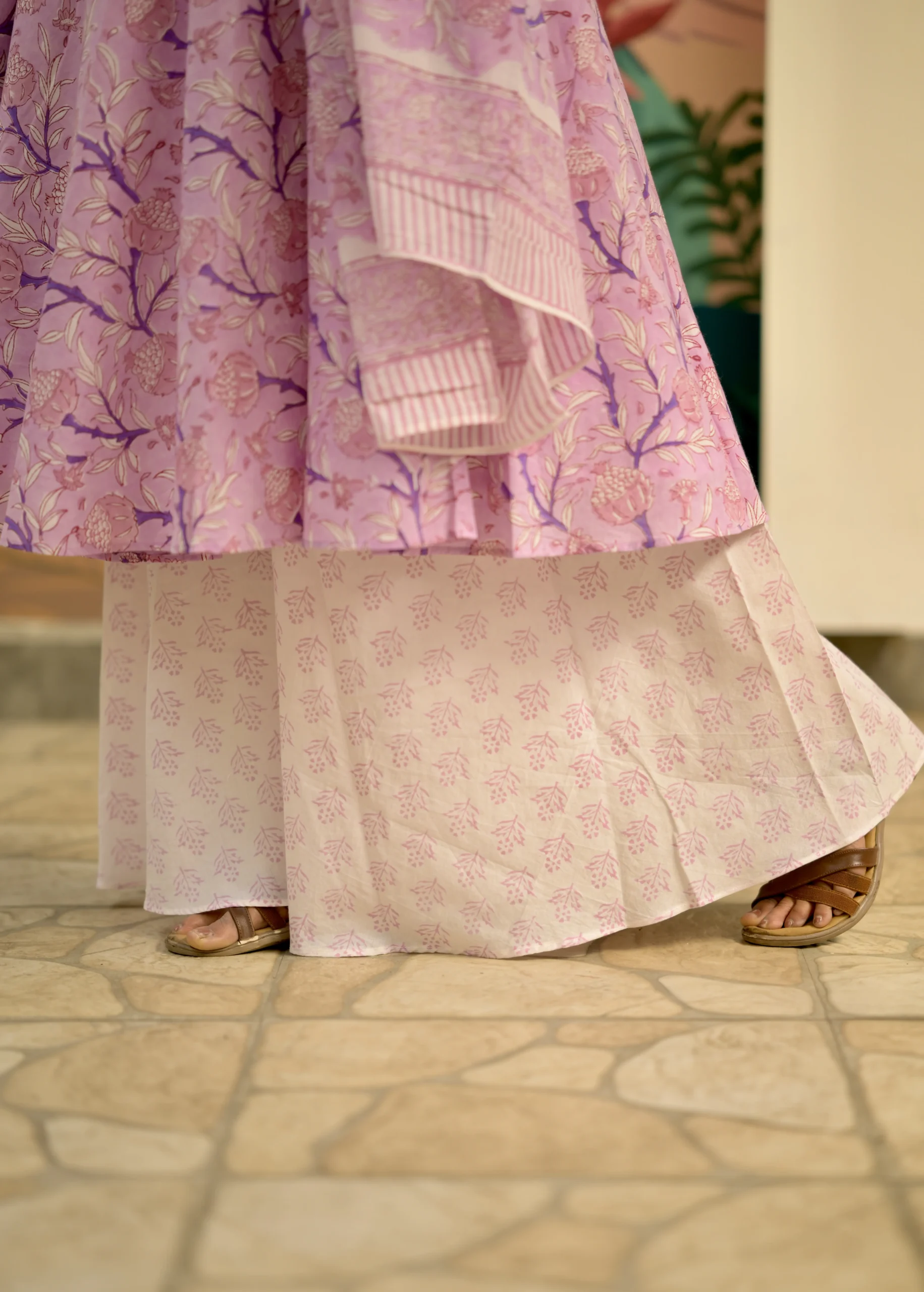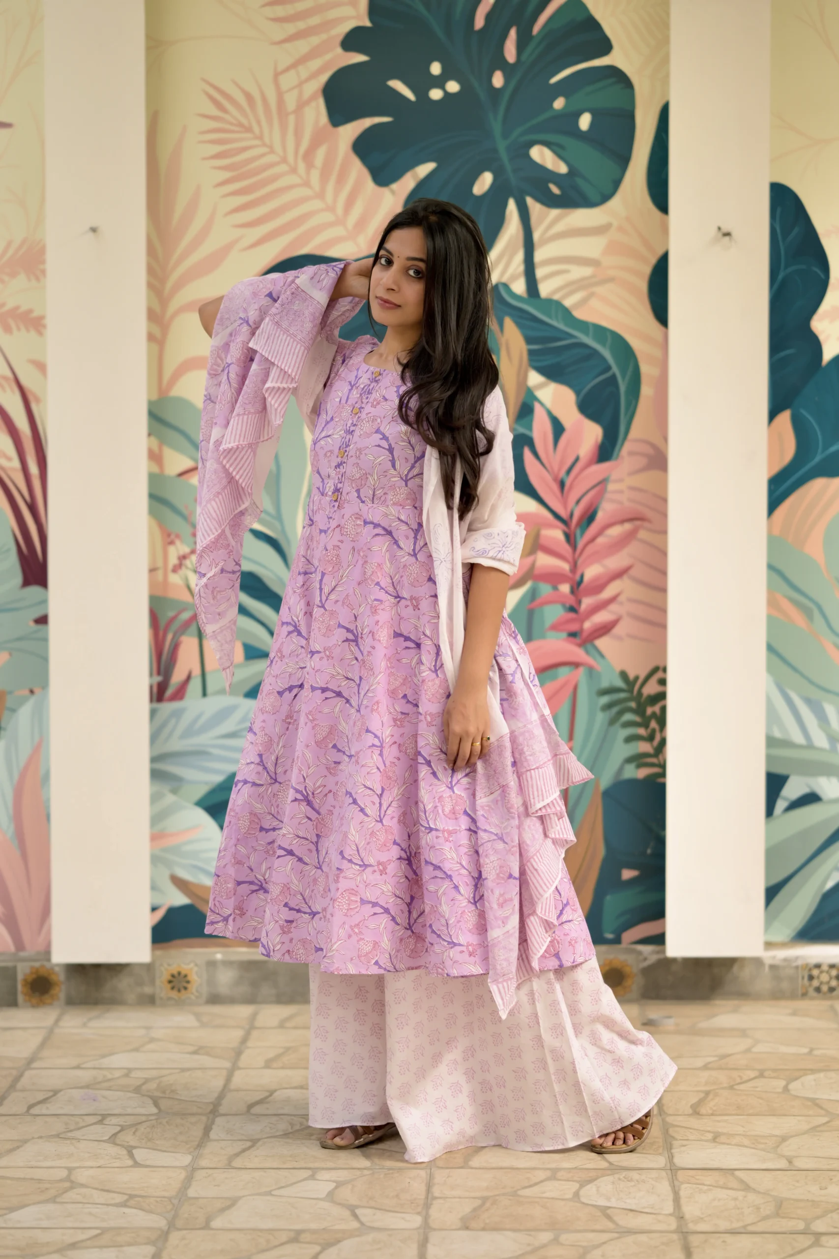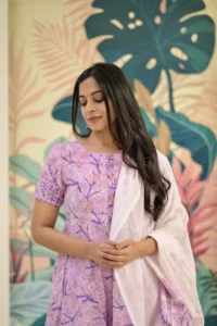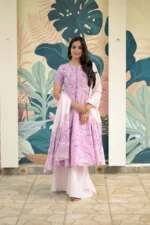 Step into effortless elegance with our Lavender Bloom Cotton Anarkali Set, crafted from soft breathable cotton for all-day comfort. The delicate lavender floral print and flowy Anarkali silhouette create a graceful look that is perfect for warm summer days.