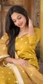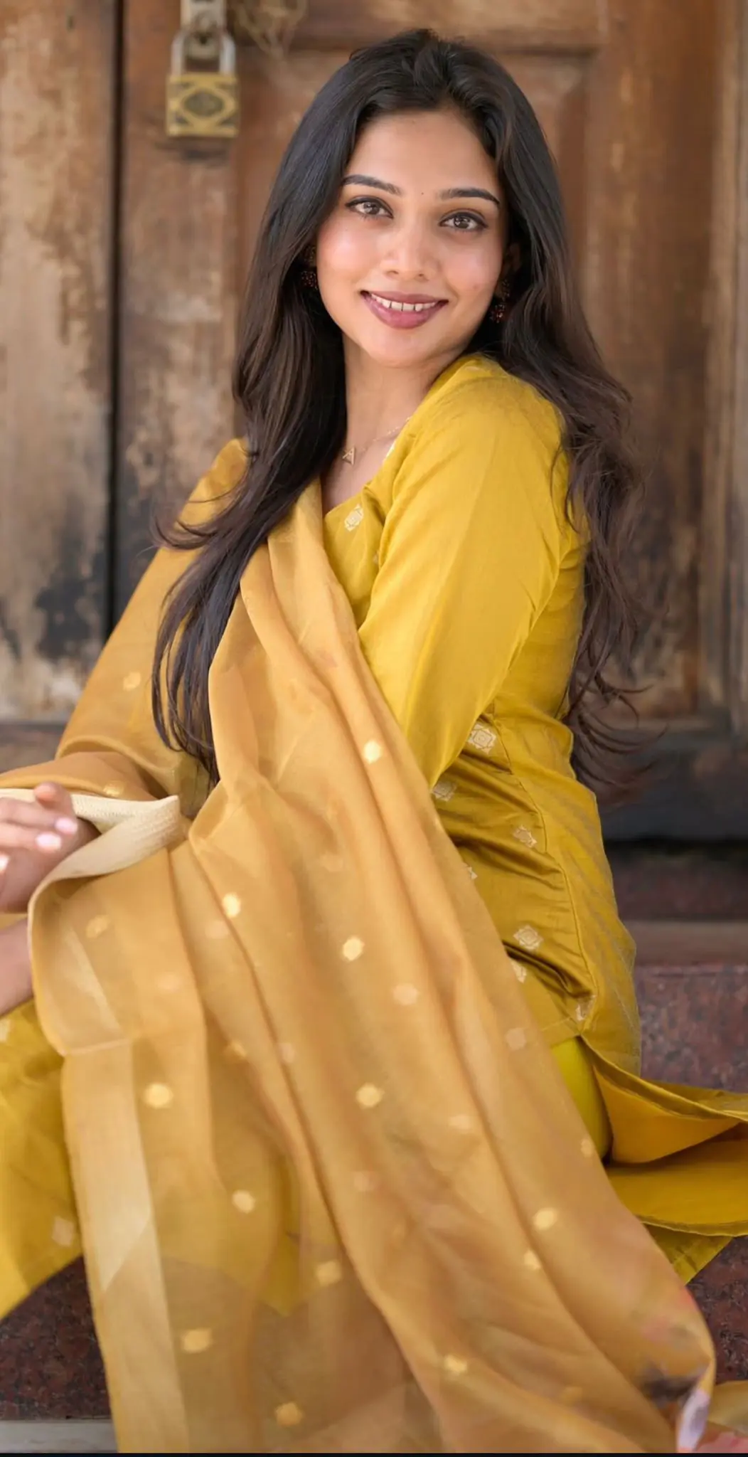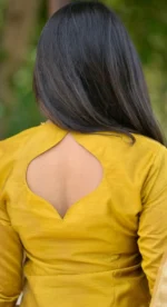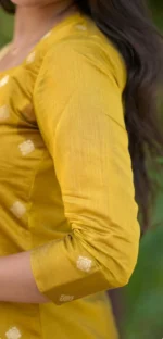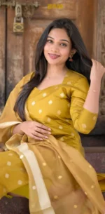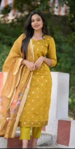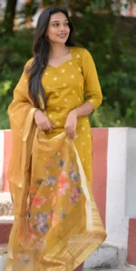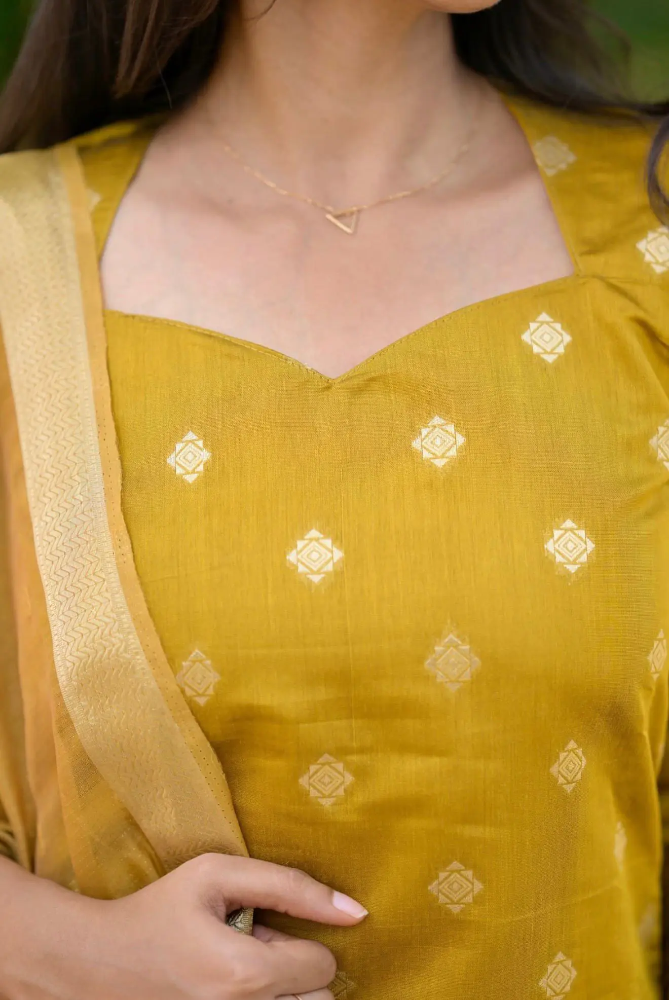Our premium Chanderi suit set in mustard yellow features elegant 3/4 sleeves, a chic back drop, and a stunning dupatta that elevates the entire look.